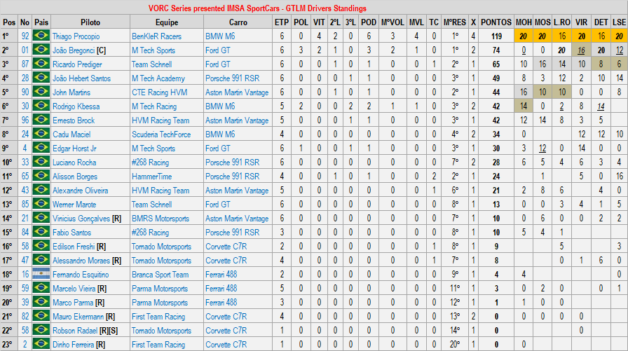 Com o título já decidido, Bruno Miranda termina o campeonato com 124 pontos, seguido por Paulo Rodrigues e Dani Gomes com 60 e 59 pontos respectivamente. Nos GTs, Procopio ficou com 119 pontos, com João Bregonci com 74 pontos e Ricardo Prediger em terceiro com 65.