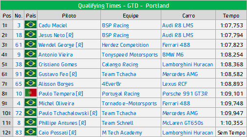 Na GTD a pole ficou com Cadu Maciel (BSP Racing) com o tempo de 1:07,753, com seu companheiro Jesus Neto em segundo com o tempo de 1:07,794, Wendel George que foi campeão da GTLM, mas teve pontos na carteira o que fez ir a GTD, pela Herdez Competition foi o terceiro colocado, ainda teve no Top 5: Antonio Vieira (Tonyspeed) e Cristiano Gomes (Calango Racing) fechando os primeiros. Dos 12 carros na categoria.